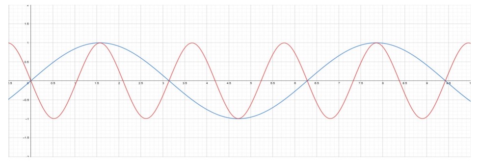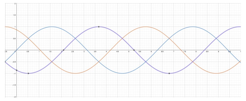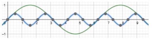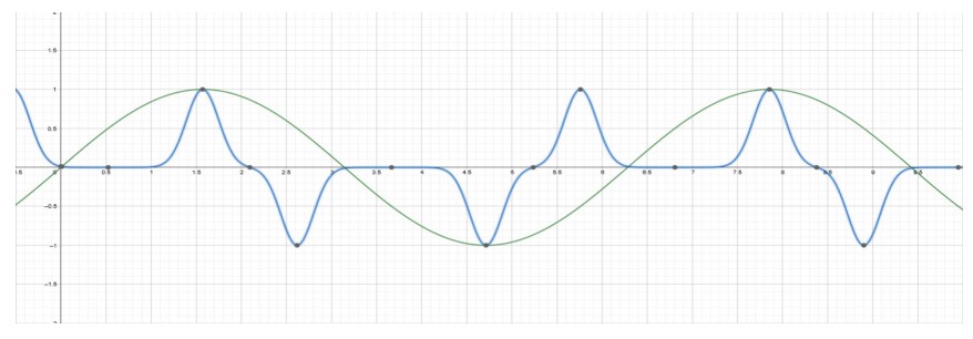 The graphic below shows the neutral current for a relatively small degree of non-linearity in the loads. The voltage on one phase is shown as a horizontal reference. Note that the current is entirely third harmonic current, 180 Hz, with no 60 Hz component. Again the magnitude is scaled to the range of -1 to +1. Even with this small degree of non-linearity, the neutral current was approximately equal to the per-phase current.