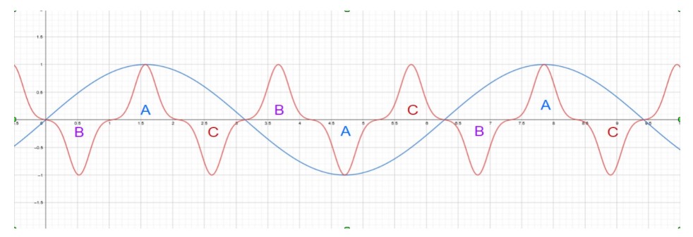 The next graphic, below, should provide a greater understanding of the mechanism for a greater degree of non-linearity. In a linear system, two or more of the loads carry current at any one time, resulting in a cancellation of current on the neutral wire. In the non-linear load case, shown below, only one phase conducts current at any one time, and the currents therefore add, rather than subtract, on the neutral wire. Therefore, the graphic shows which phase is introducing current to the neutral wire for each pulse. Because the currents add on an RMS basis, the neutral current will be √3=1.732 times the current on any phase, rather than three times the phase current. Again, the neutral current has no 60 Hz component and is largely third harmonic current at 180 Hz, with components at 360, 540, 720, … Hz. The letters, A, B or C, indicate which phase is supplying current to the neutral wire at any one time. Again, the A-phase voltage is shown as a horizontal reference in blue.